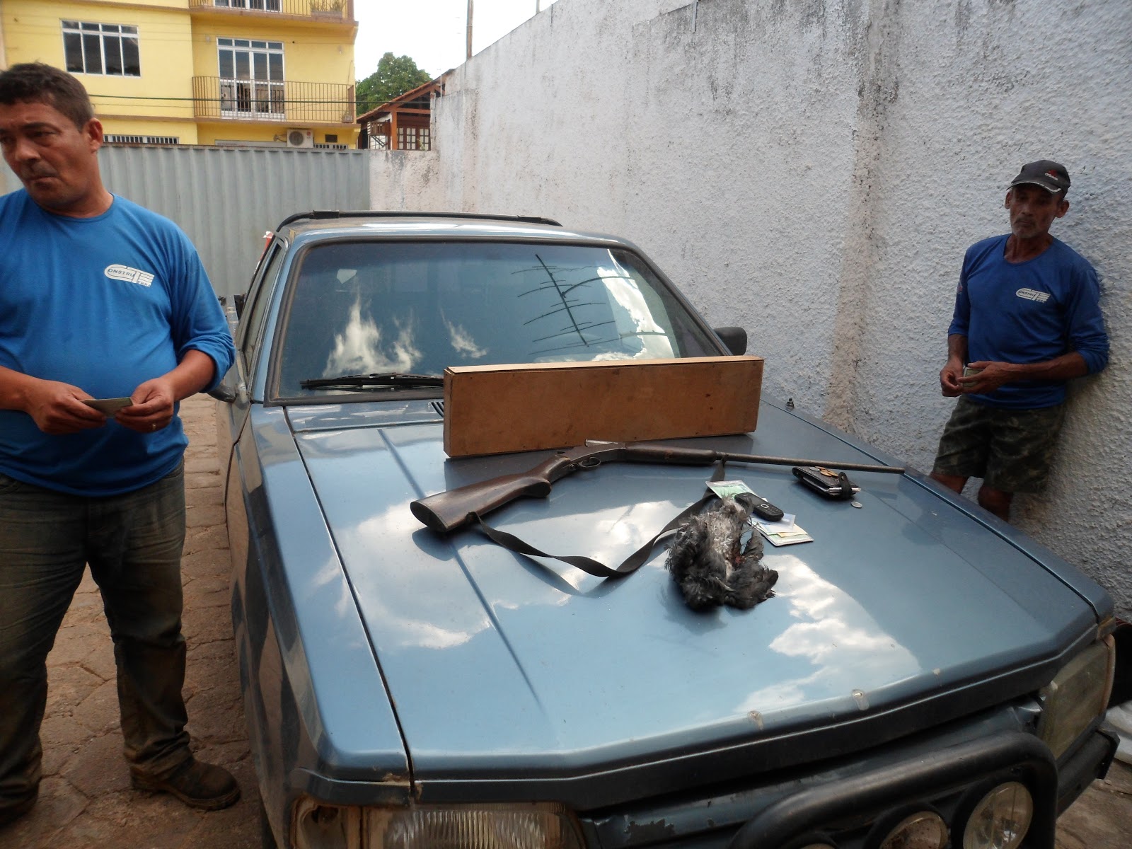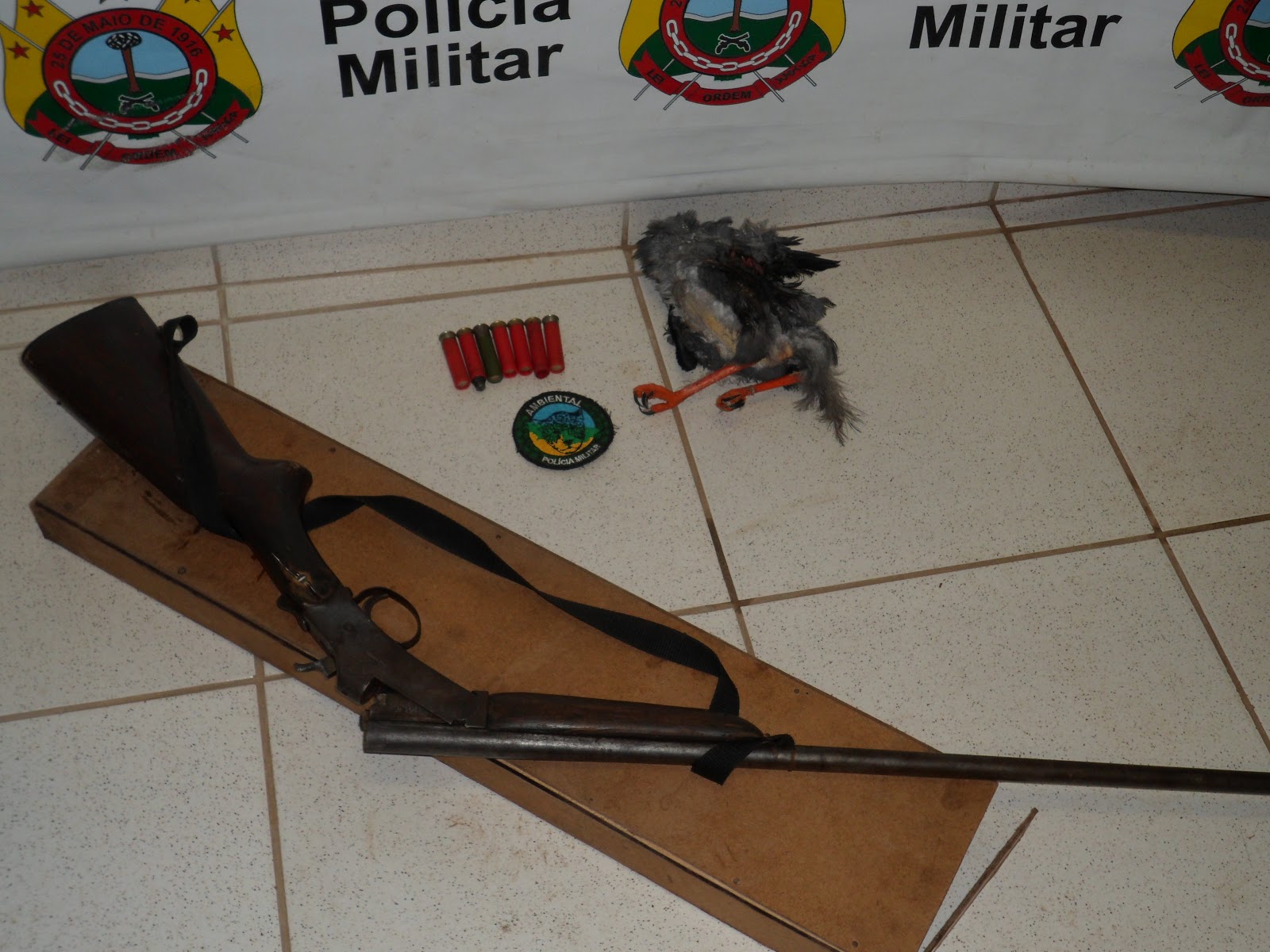 EM PATRULHAMENTO E AO EFETUAR UMA ABORDAGEM AO VEICULO FORD PAMPA DE COR AZUL PLACAS MZQ 0627, CONDUZIDO PELO SR. PEDRO FELIPE, FOI ENCONTRADO NO INTERIOR DO REFERIDO VEÍCULO UMA ESPINGARDA CAL. 32 E 07( SETE ) CARTUCHOS INTACTOS E UM PÁSSARO DA ESPÉCIE GAVIÃO ABATIDO, A REFERIDA ARMA ENCONTRAVA-SE DENTRO DE UMA CAIXA DE MADEIRA ESCONDIDA ATRÁS DO BANCO DO PASSAGEIRO DO VEÍCULO E O PÁSSARO DENTRO DE UM A SACO PLÁSTICO . NA CARROCERIA DO VEÍCULO ENCOTRAVA-SE VÁRIAS REDES DE PESCA E UM CAIXA DE ISOPÔR COM ALGUNS PEIXES; QUE O SR. FRANCISCO BARBOSA DE OLIVEIRA SE APRESENTOU COMO PROPRIETÁRIO DA ARMA APREENDIDA; E QUE SEGUNDO OS CONDUZIDOS ELES ESTAVAM VINDO DE UMA PESCARIA NA ESTRADA DE PORTO ACRE KM 39. A ARMA BEM COM O PASSÁRO ABATIDO E OS CARTUCHOS E O VEÍCULO UTILIZADO NO TRANSPORTE DOS CONDUZIDOS FORAM APREENDIDOS E APRESENTADOS NA DELEGACIA DE FLAGRANTES DA 1ª REGIONAL.